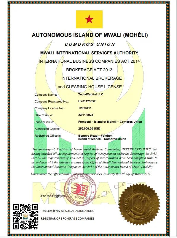 Tech4Capital LLC is fully licensed and regulated by the MWALI International Services Authority. Our dual approach of meeting stringent onshore regulatory standards in our operations, while working with an offshore regulator allows us the flexibility to adapt to our partners needs while providing the security that every investor wants.
